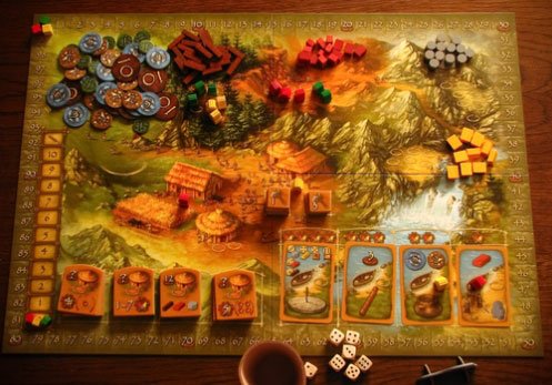 Первое, что хочется отметить — исключительное качество исполения и отличную комплектацию. Игра недешевая, но открыв коробку, вы сразу понимаете за что заплатили деньги. Красочно оформленное игровое поле, симпатичные кубики (и даже стаканчик для них), удобные пластиковые фишки ресурсов, карточки, напечатанные на добротном картоне: В общем, не к чему придраться.